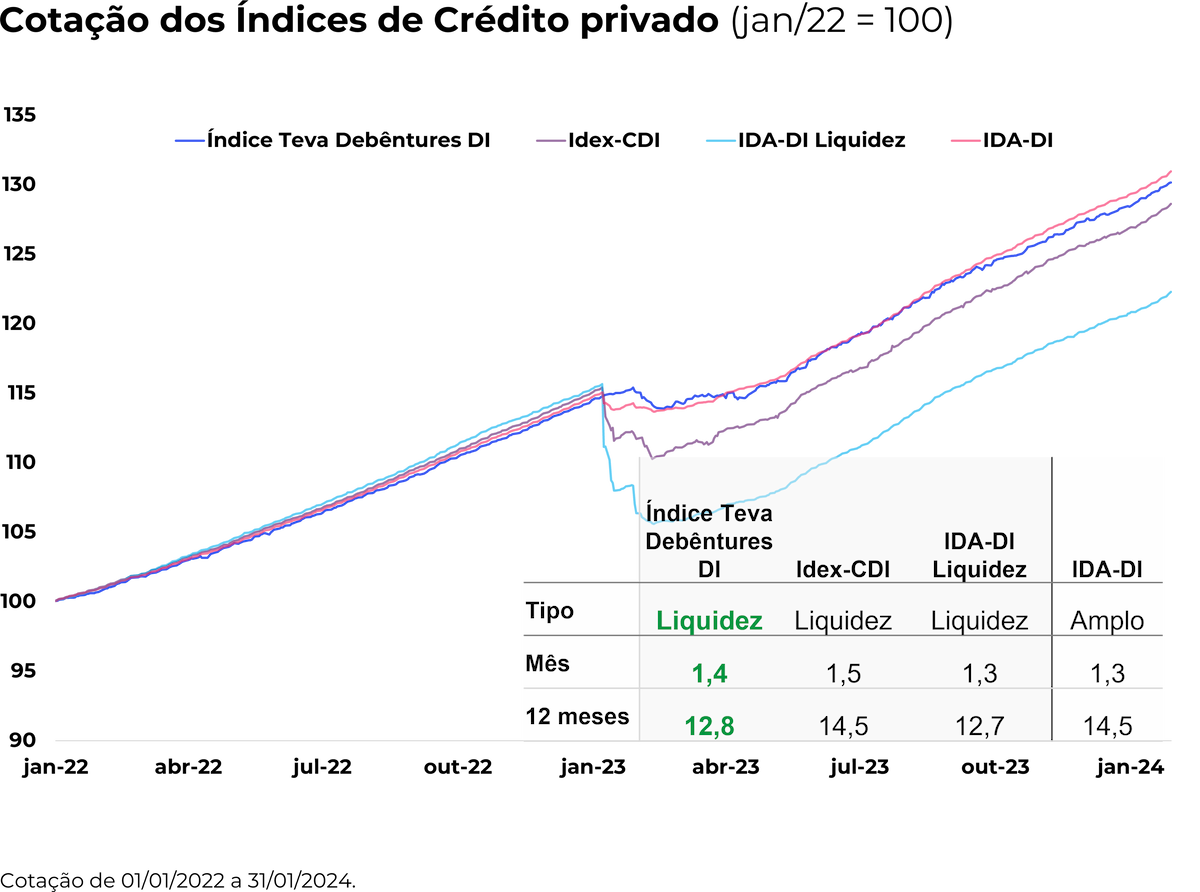 Em janeiro, o Índice Teva Debêntures DI teve um desempenho de 1,4%, performando 142,2% do DI esse mês.
