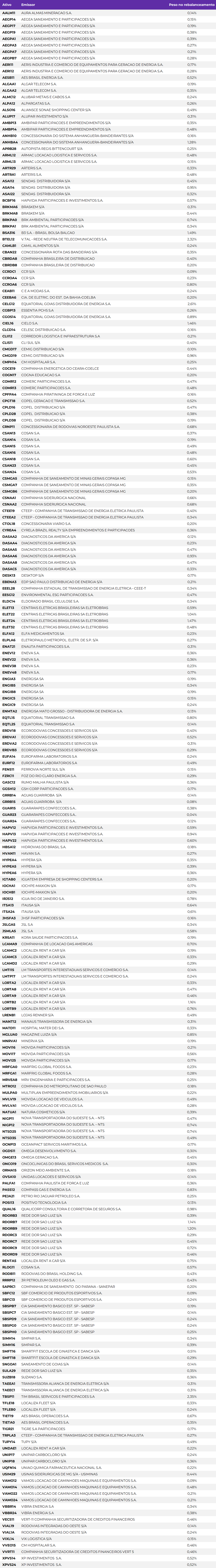 A Teva Indices divulga mensalmente o rebalanceamento do Índice Teva Debêntures DI, que foi a base para a criação do DEBB11, o primeiro ETF de crédito privado do Brasil.