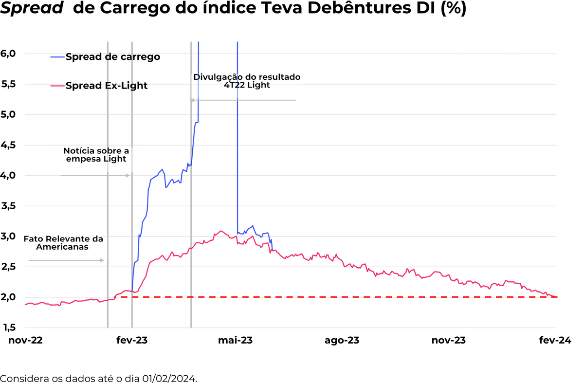Ao encerrar o mês de janeiro, o spread de carrego registrado foi de DI + 2,04%, o que representa uma queda em relação ao valor pré-evento da Americanas, que era de 2,10%. Essa redução indica um cenário de recuperação para o setor de crédito privado. Em comparação com dezembro, houve uma diminuição de 0,19% no spread, mostrando uma percepção de risco menor neste período.