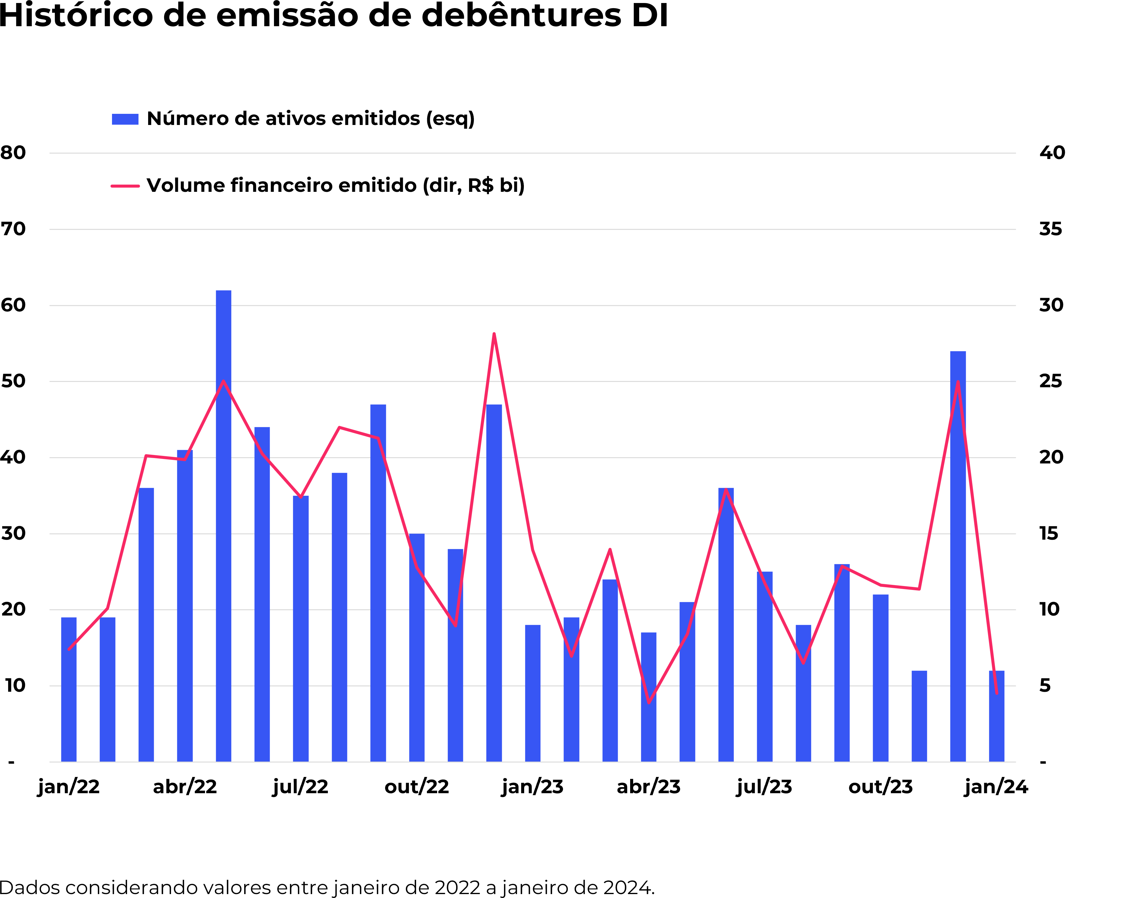 Em 2024, o ano se iniciou com uma diminuição nas novas emissões de debêntures indexadas ao DI. Apenas 12 novas emissões foram registradas, resultando em um volume financeiro total de R$ 5 bilhões.