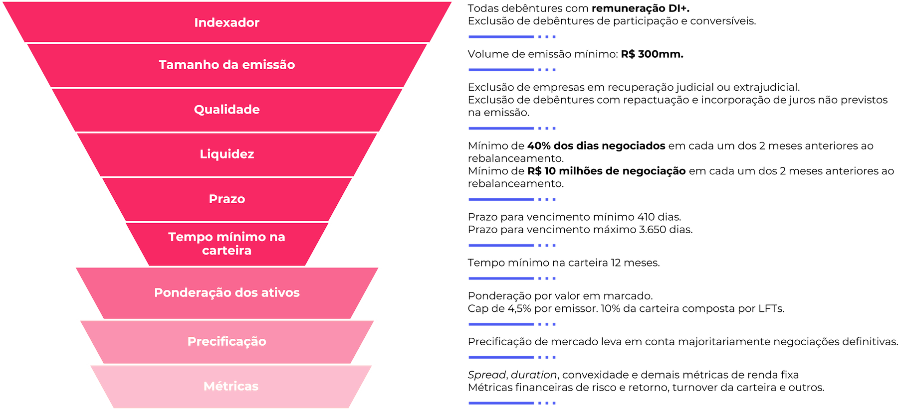 Essa metodologia tem como objetivo proporcionar aos investidores diversificação em uma carteira com spreads reduzidos e ativos de alta qualidade e relevância, oferecendo assim uma exposição a títulos financeiros com menor risco e maior liquidez.