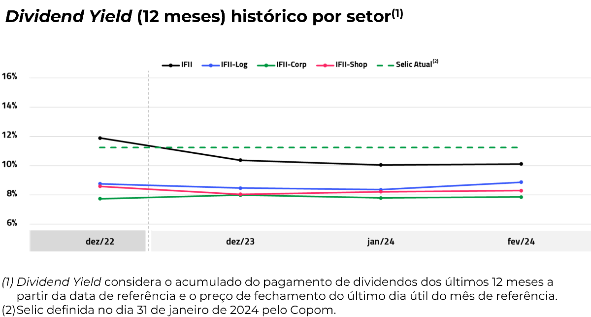 O maior DY de 12 meses em fevereiro foi do IFII-P com 11,9%. Já entre os setoriais o destaque fica para o IFII-Log com 8,9%.