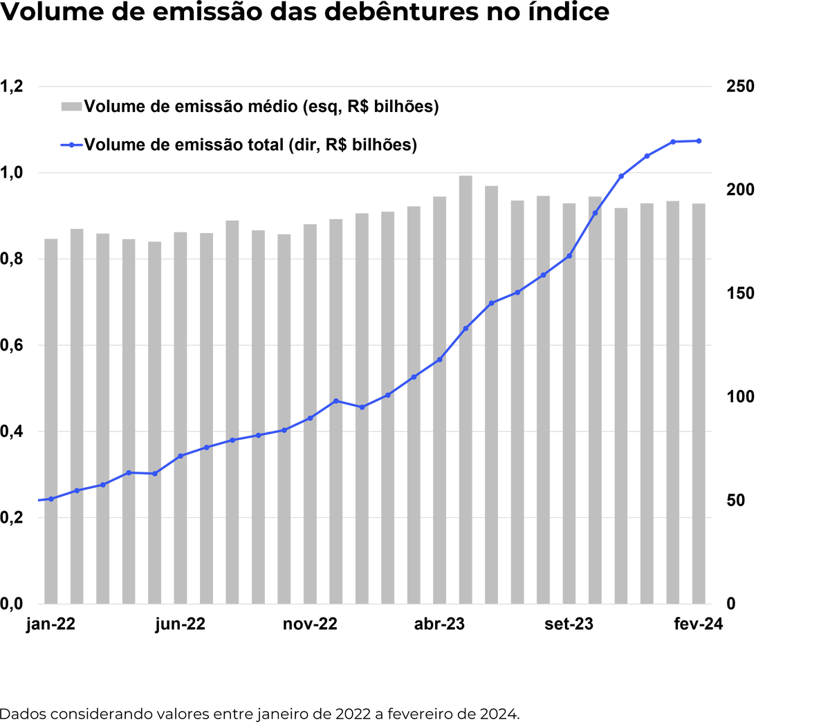 O volume de emissão média da carteira está em R$ 928 milhões, com um volume de emissão total de R$ 224 bilhões.