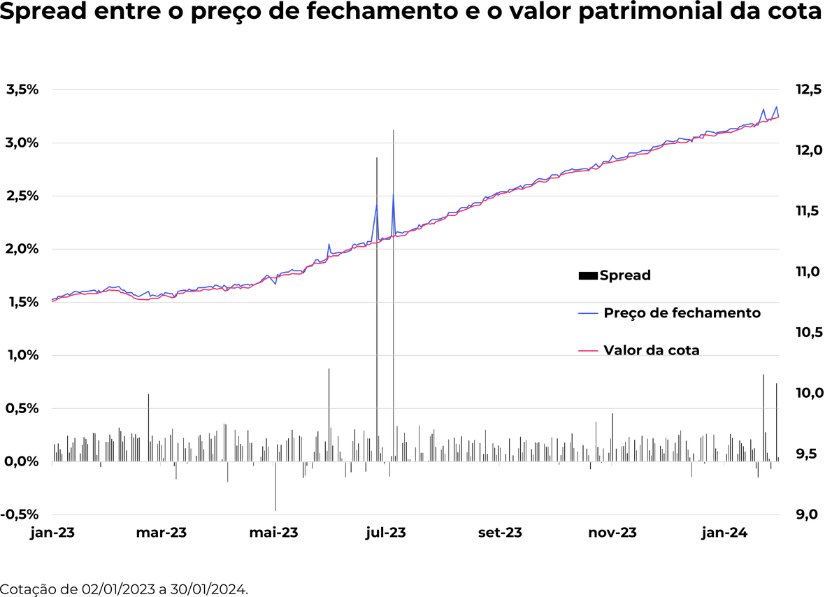 No mês de janeiro, o spread médio foi de 0,17%, calculado entre o preço de fechamento e o valor patrimonial. O ETF DEBB11 oferece spreads de negociação baixos, proporcionando uma experiência de investimento mais acessível e eficiente, sem os desafios comuns associados às negociações no mercado de balcão.
