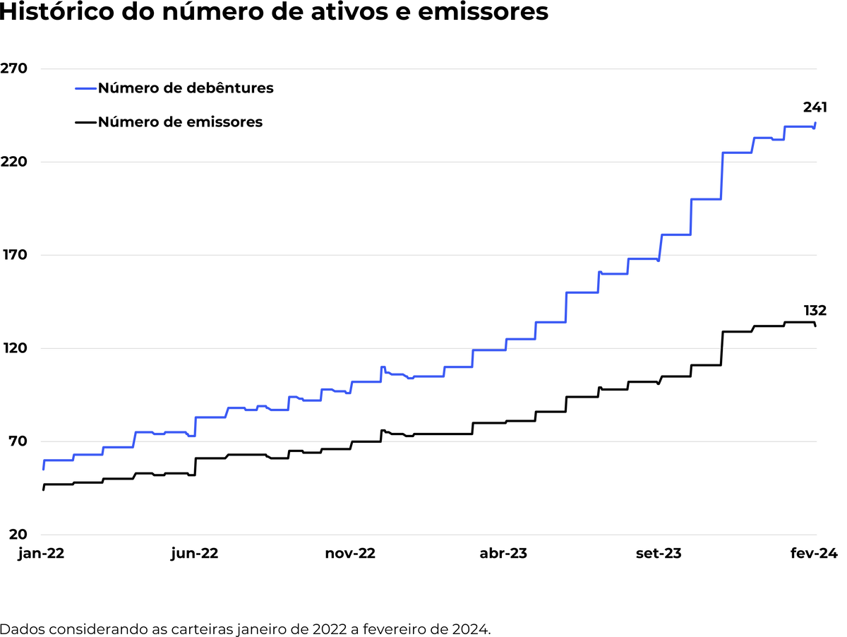 Essa abordagem estratégica não apenas fortalece a resistência da carteira diante de flutuações específicas do mercado, mas também oferece aos investidores uma maneira mais equilibrada e prudente de acessar o segmento de debêntures.