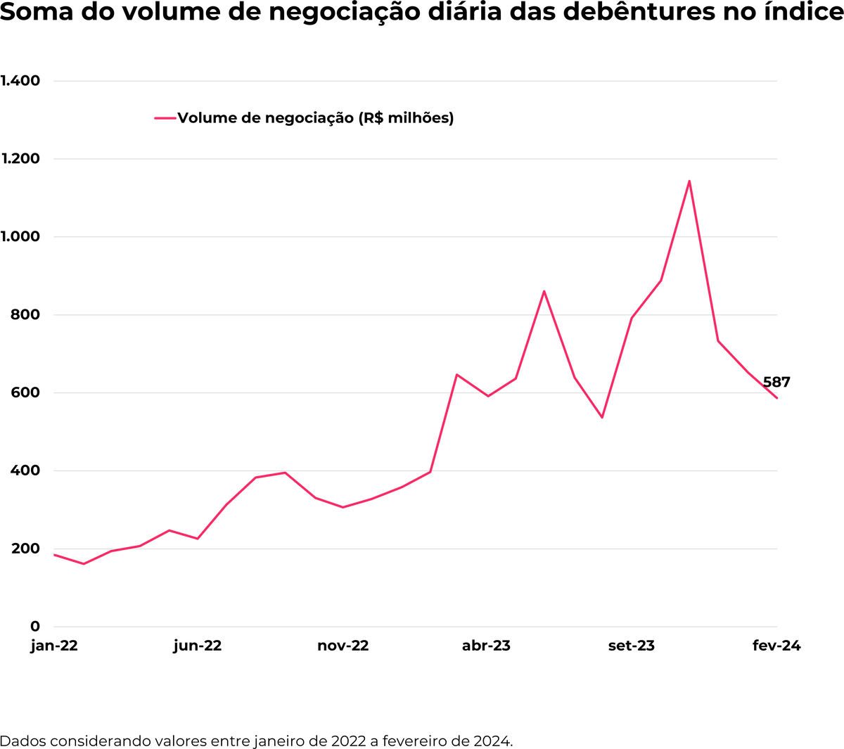 Em janeiro o valor de negociações médias por dia das debêntures no índice seguiu em queda com um total de R$ 587 milhões.