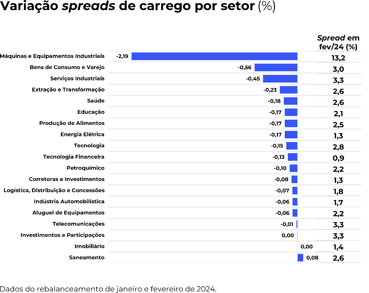 A maioria dos setores registrou uma queda em seus spreads, indicando uma maior confiança no mercado de crédito privado neste início de 2024. Essa tendência sugere uma percepção mais otimista dos investidores em relação ao risco associado aos ativos nesses setores específicos.