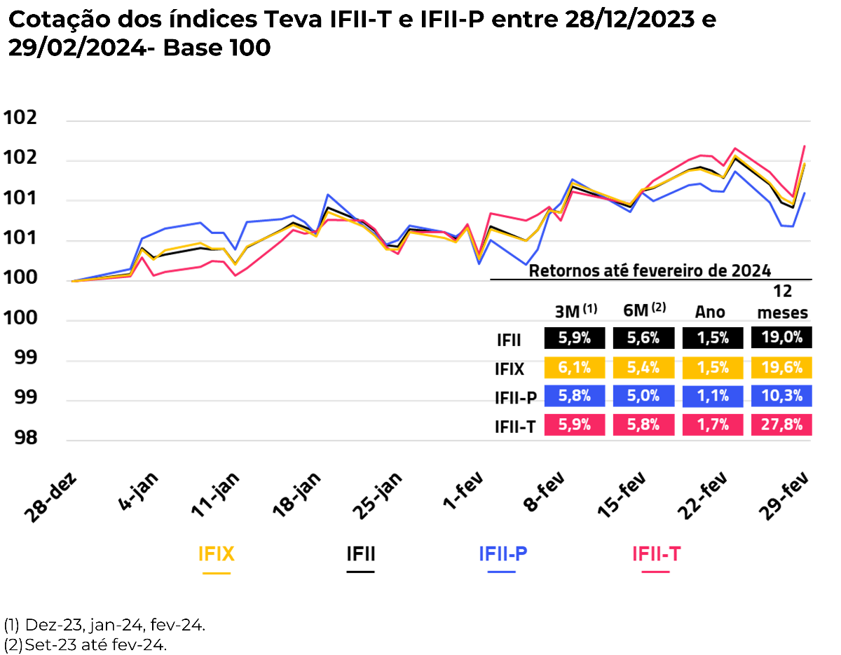 Durante o mês de fevereiro, o IFII-T superou o retorno do IFII, registrando uma valorização de 0,2 pontos percentuais adicionais. Além de se destacar mensalmente, o IFII-T obteve a maior valorização nos últimos 12 meses entre seus comparáveis, alcançando um retorno de 27,8%.