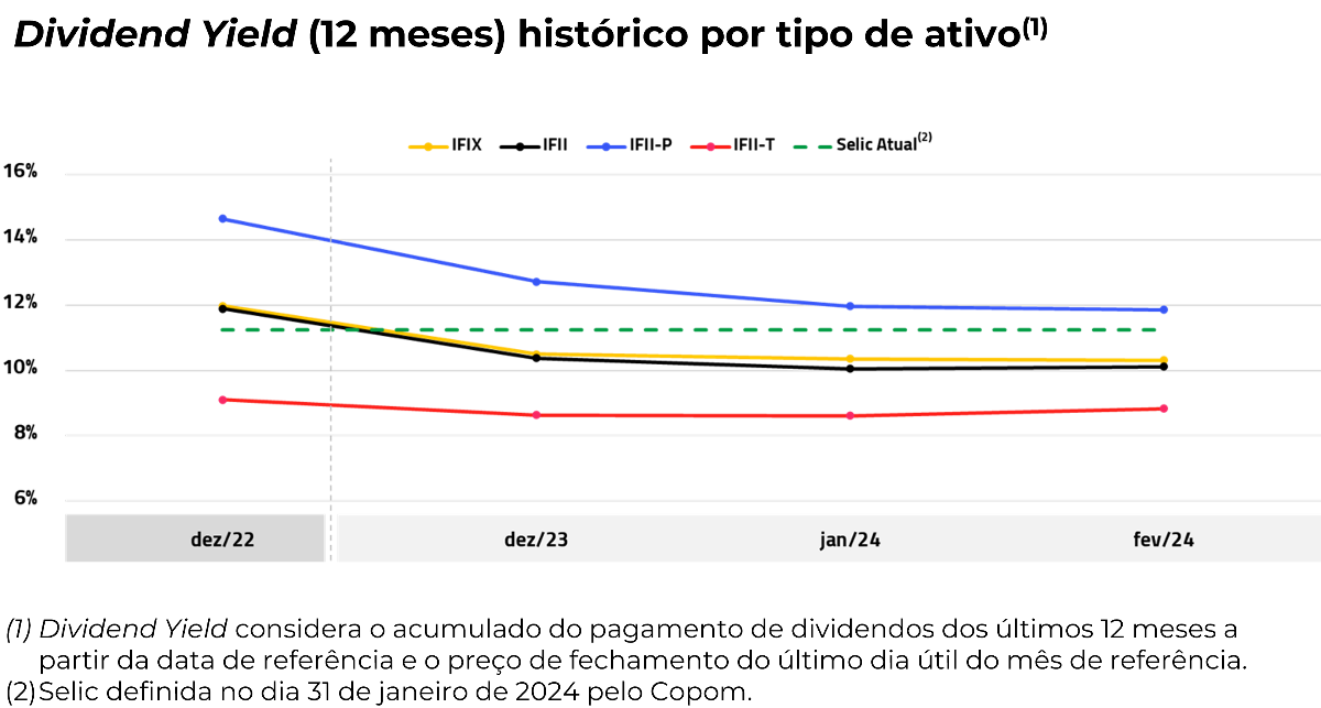 O IFII-P se destaca ao registrar o maior dividend yield entre os índices, com 11,9%. A maioria dos índices apresentaram redução dos dividend yields (DY) entre dezembro de 2022 e fevereiro 2024.