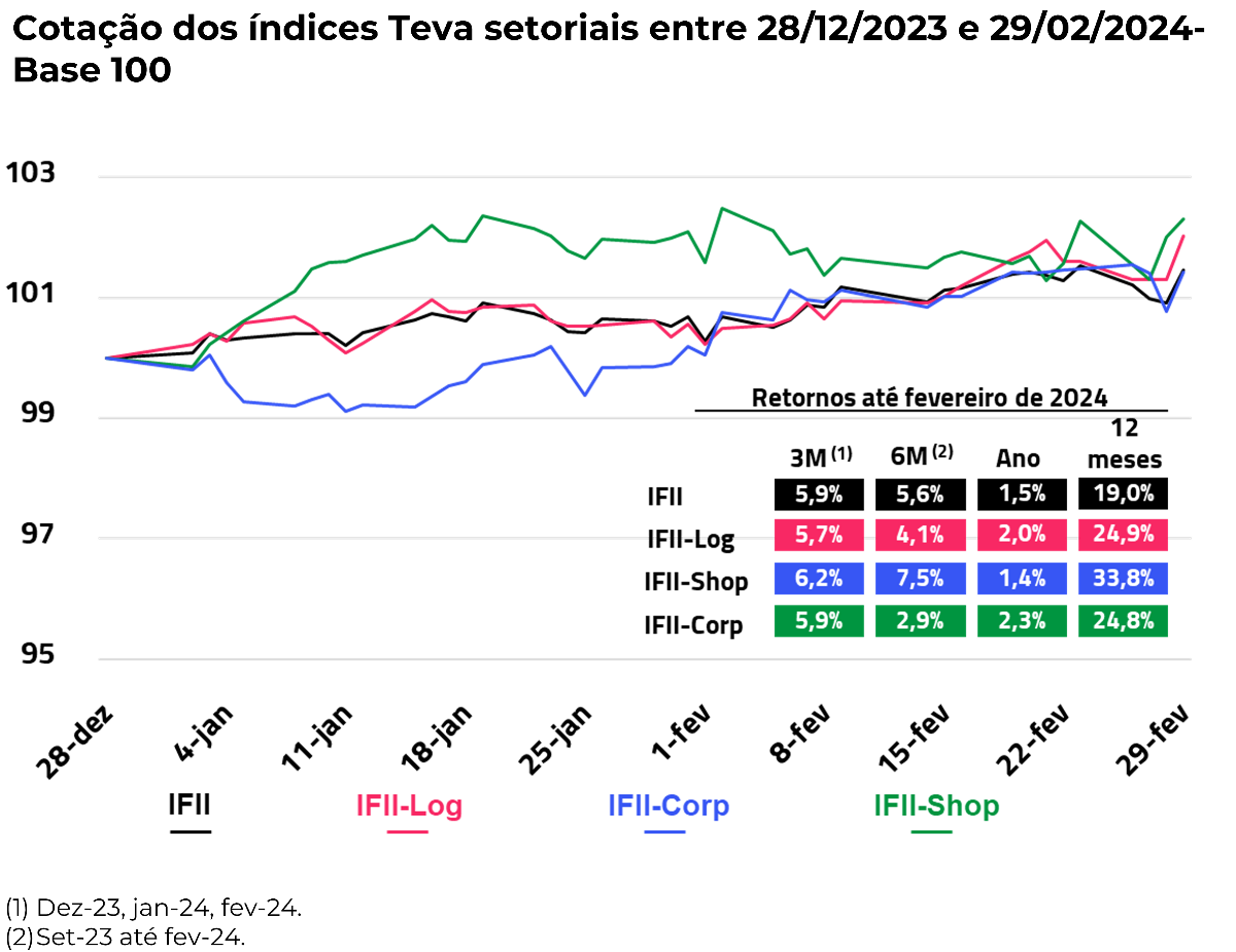 Entre os setores, o IFII-Corp destaca-se por apresentar o maior retorno no início de 2024 com 2,3%, contra 2,0% do IFII-Log e 1,4% do IFII-Shop.