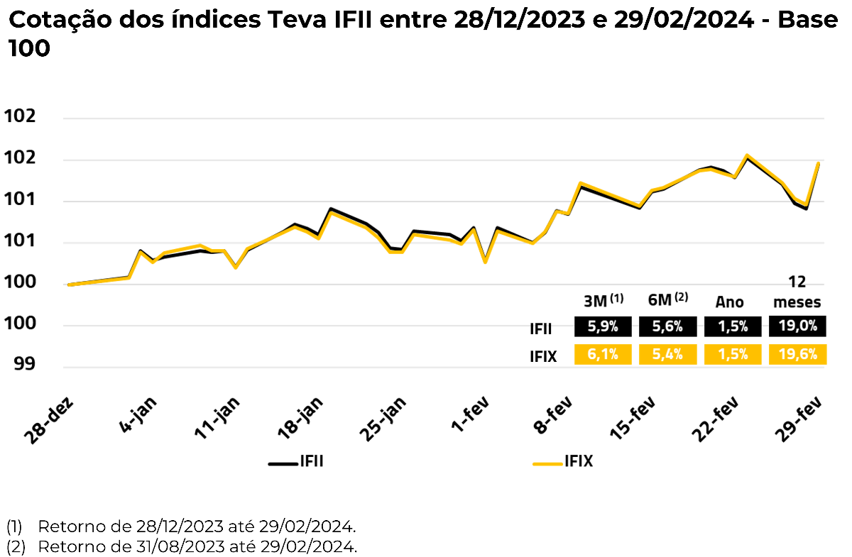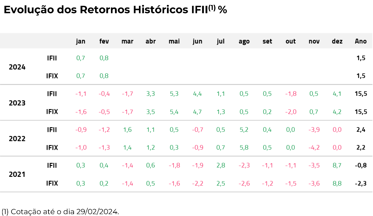 Em fevereiro, tanto o IFII quanto o IFIX fecharam com performance positiva de 1,5% desde o início do ano.