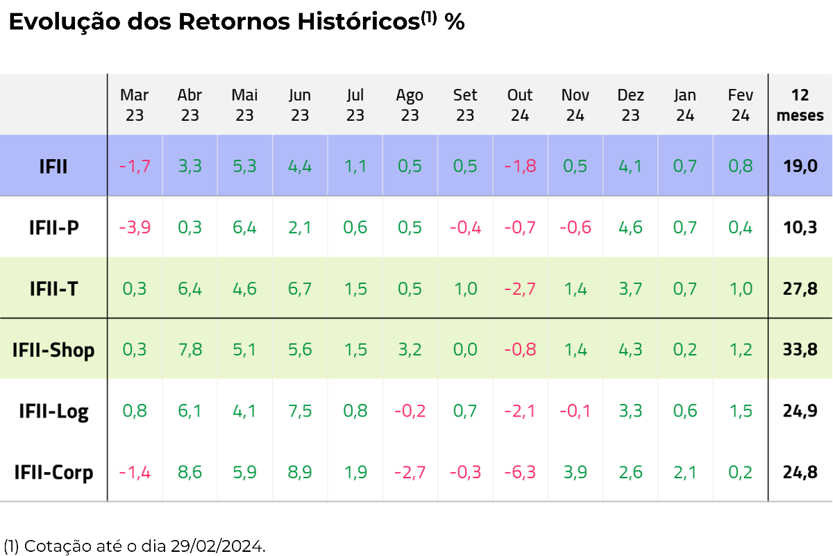 Destaque para o desempenho do IFII-Shop, líder setorial com uma valorização de 33,8% nos últimos 12 meses. O IFII-T obteve a maior valorização dos últimos 12 meses, indicando maior crescimento do segmento em relação a outros tipos de ativos.