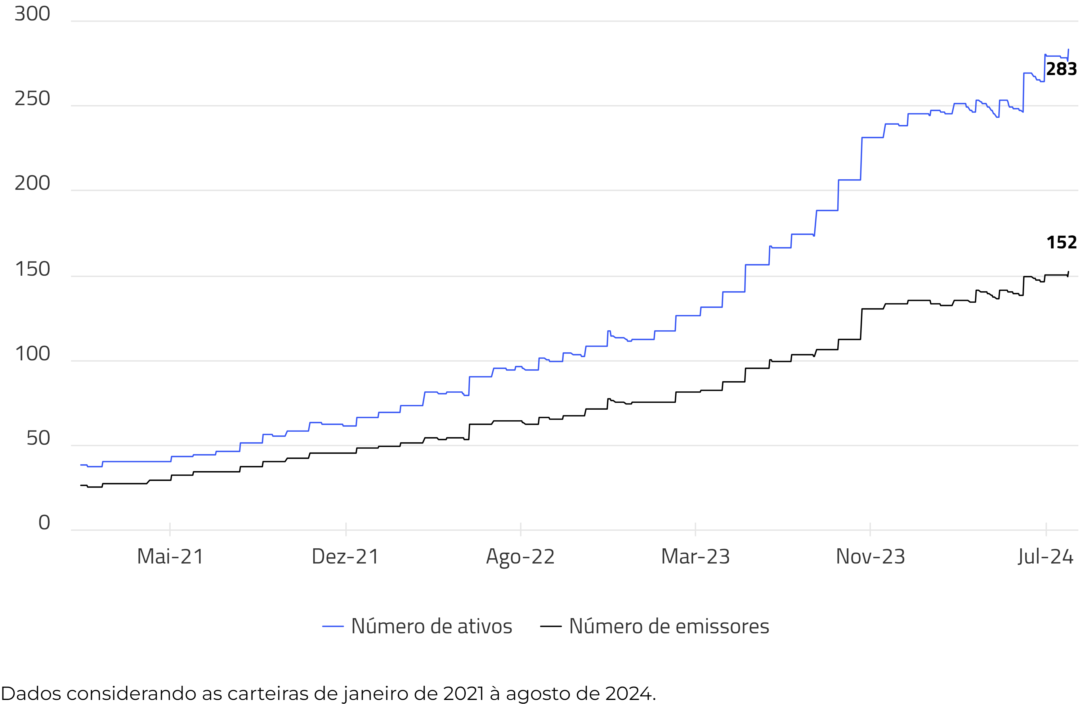 No rebalanceamento de agosto, o Índice Teva Debêntures DI teve um aumento total de 3 debêntures em sua carteira, resultando em 283 ativos emitidos por 152 emissores diferentes.