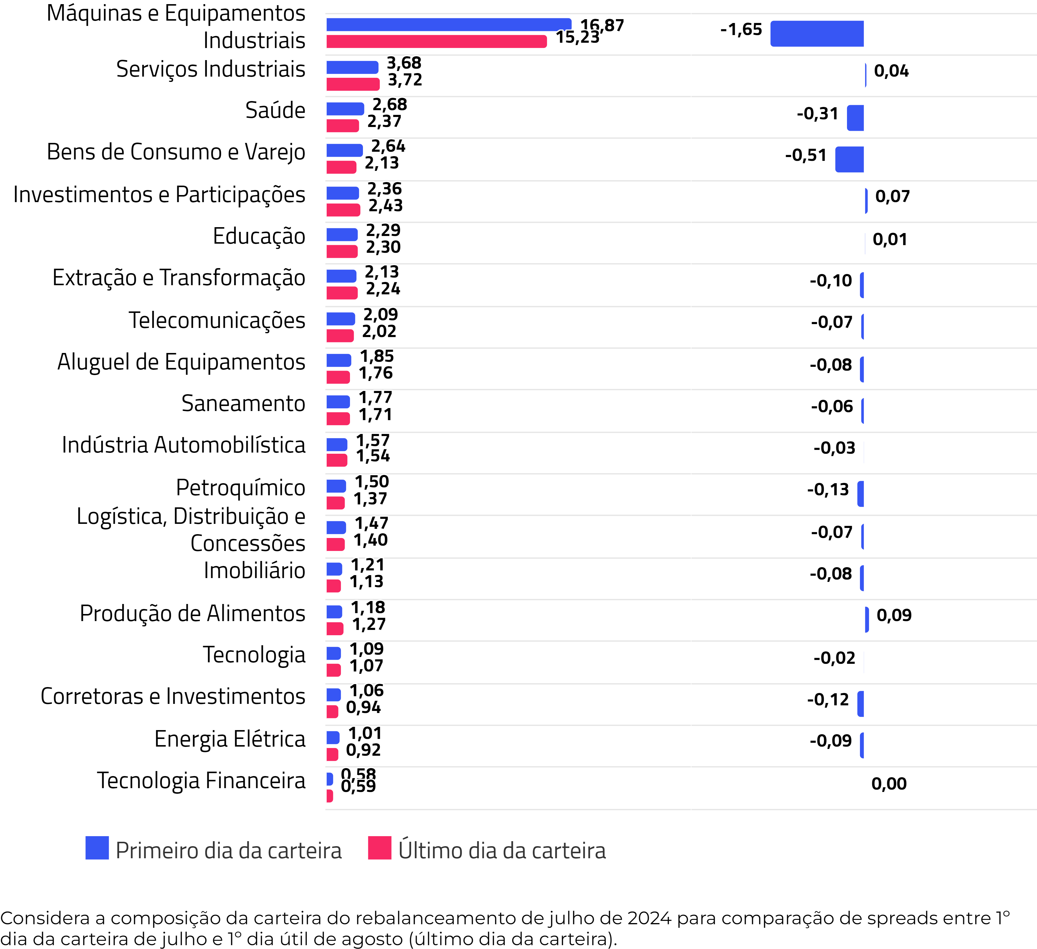 Cabe destacar que uma queda dos spreads dos ativos está ligada a uma diminuição no preço do ativo e a um acréscimo no retorno esperado. Esse padrão evidencia diversos aspectos, sendo o principal deles um aumento no prêmio de risco, indicativo de que os investidores estão percebendo um ambiente mais arriscado. Ao se analisar de forma separada por setor, é possível avaliar a confiança do mercado em cada área específica diante do cenário econômico atual.