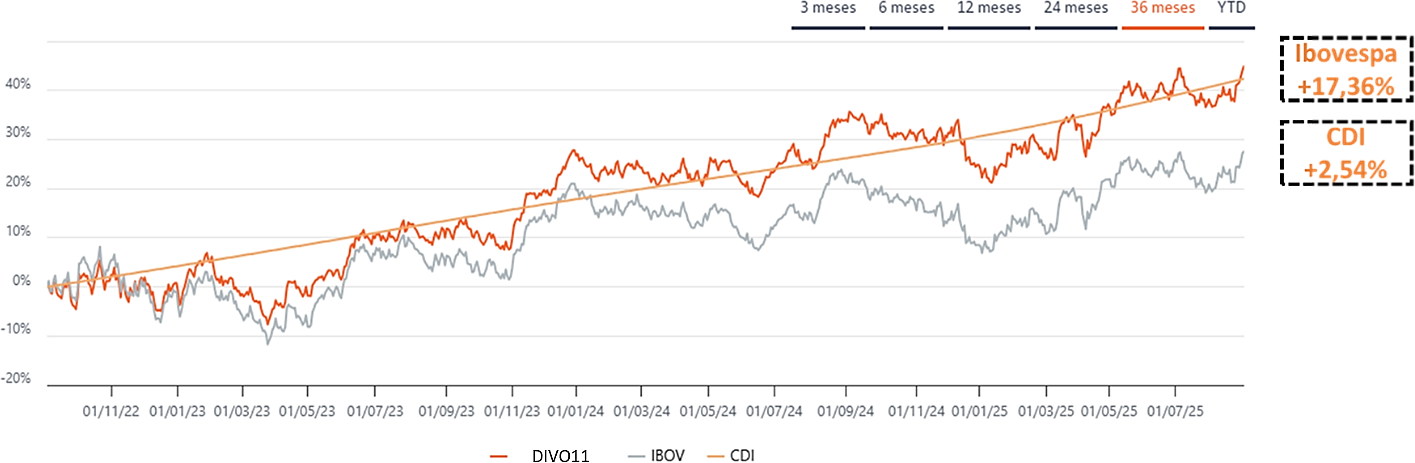 No ETF DIVO11 os dividendos e JCP das empresas são reincorporados ao próprio ETF, aumentando os seus investimentos ao longo do tempo e reforçando a importância de permanecer investido: os gráficos de 12, 24 e 36 meses mostram como o DIVO11 se manteve resiliente frente ao Ibovespa e, em várias janelas, superou o CDI — um benchmark de respeito.