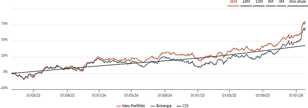 O gráfico a seguir exemplifica bem esse dilema: o investidor que deteve o ETF DIVO11 desde 2023, conseguiu acompanhar o CDI mesmo com uma estratégia de renda variável. A partir de 2025 a paciência começa a revelar a sua importância pois hoje, a estratégia acumula retorno de 77% no período ou CDI +35%.