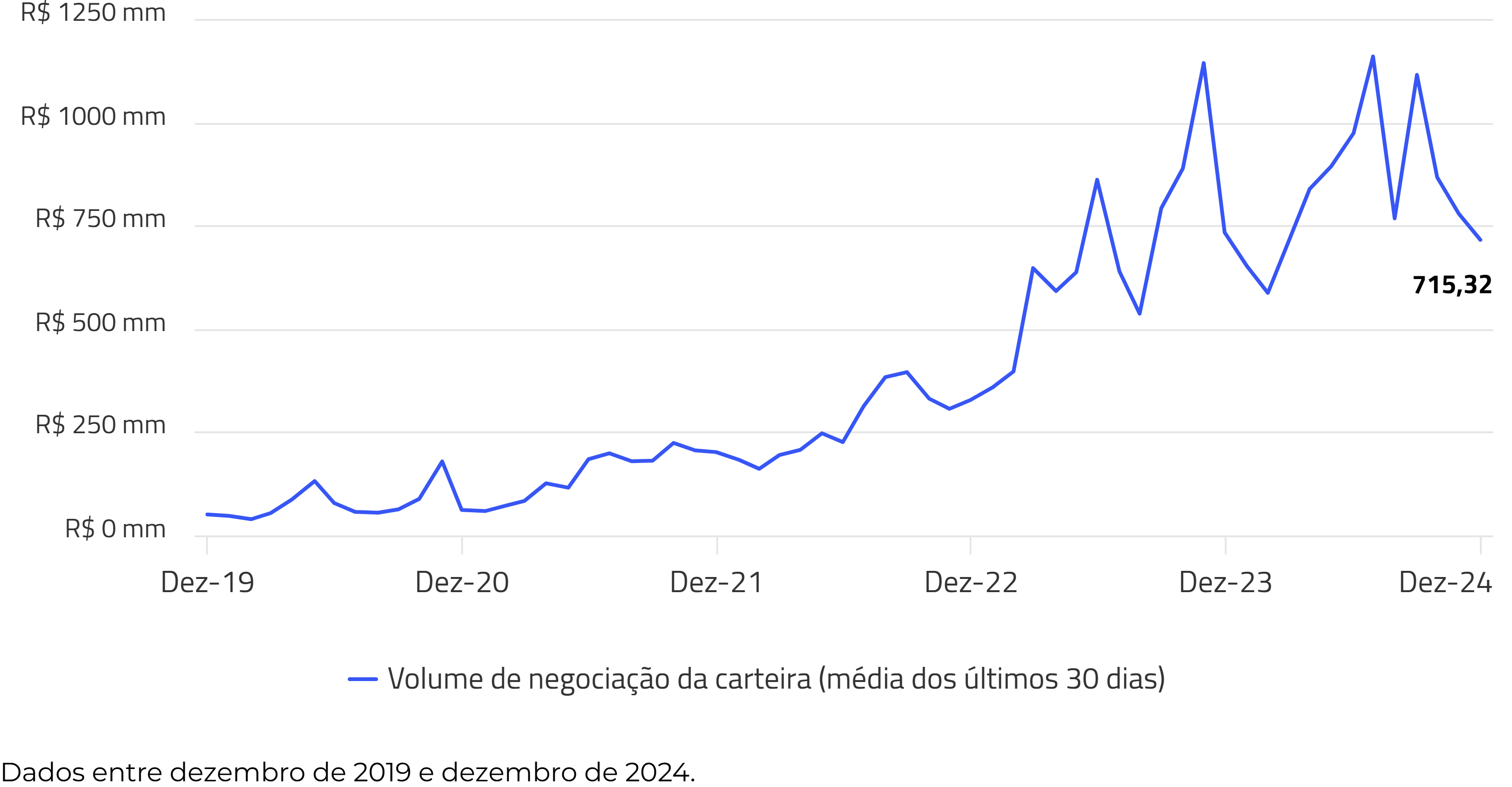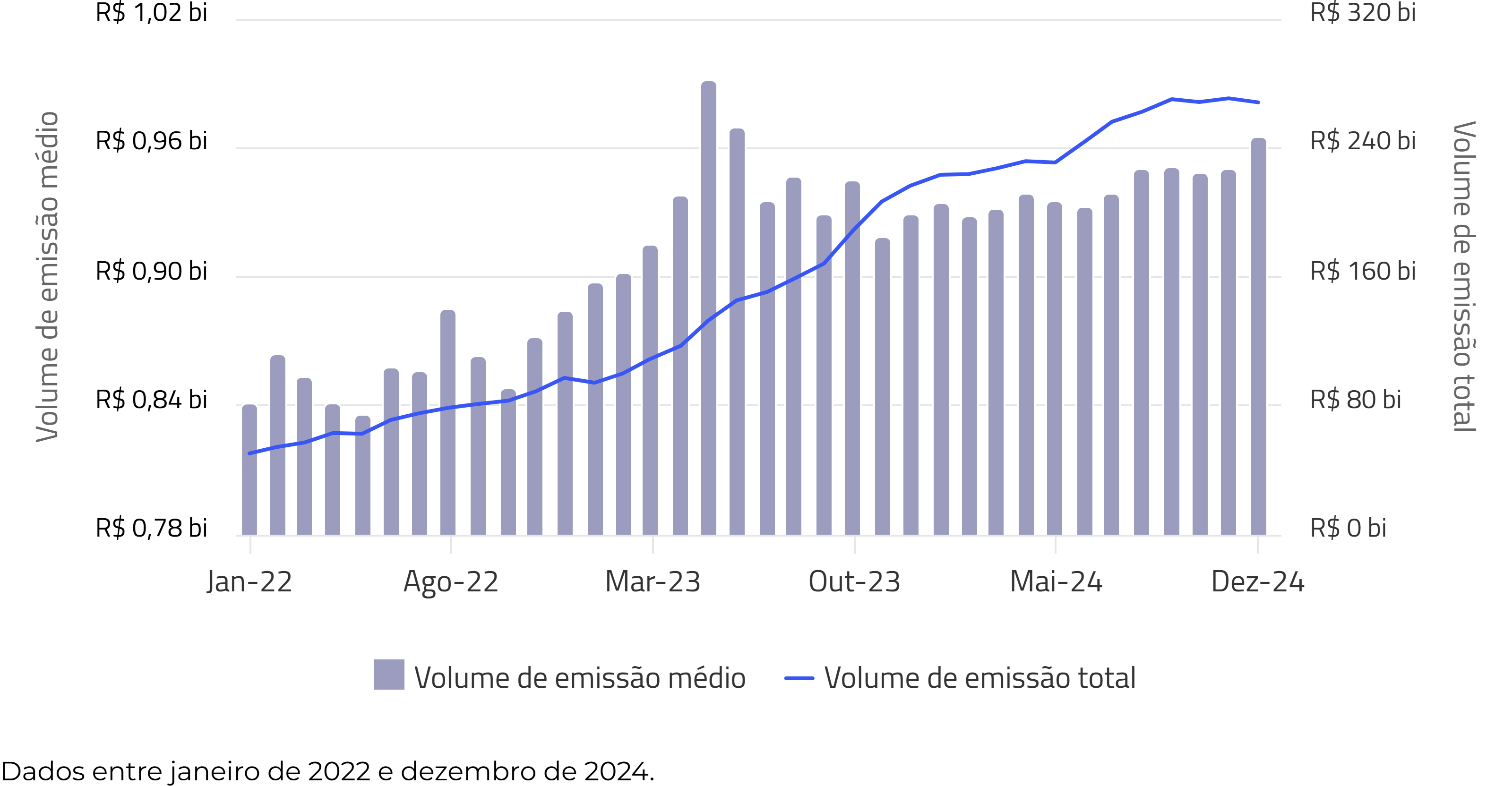 O volume de emissão médio da carteira está em R$ 965 milhões, com um volume de emissão total de R$ 268 bilhões em novembro.