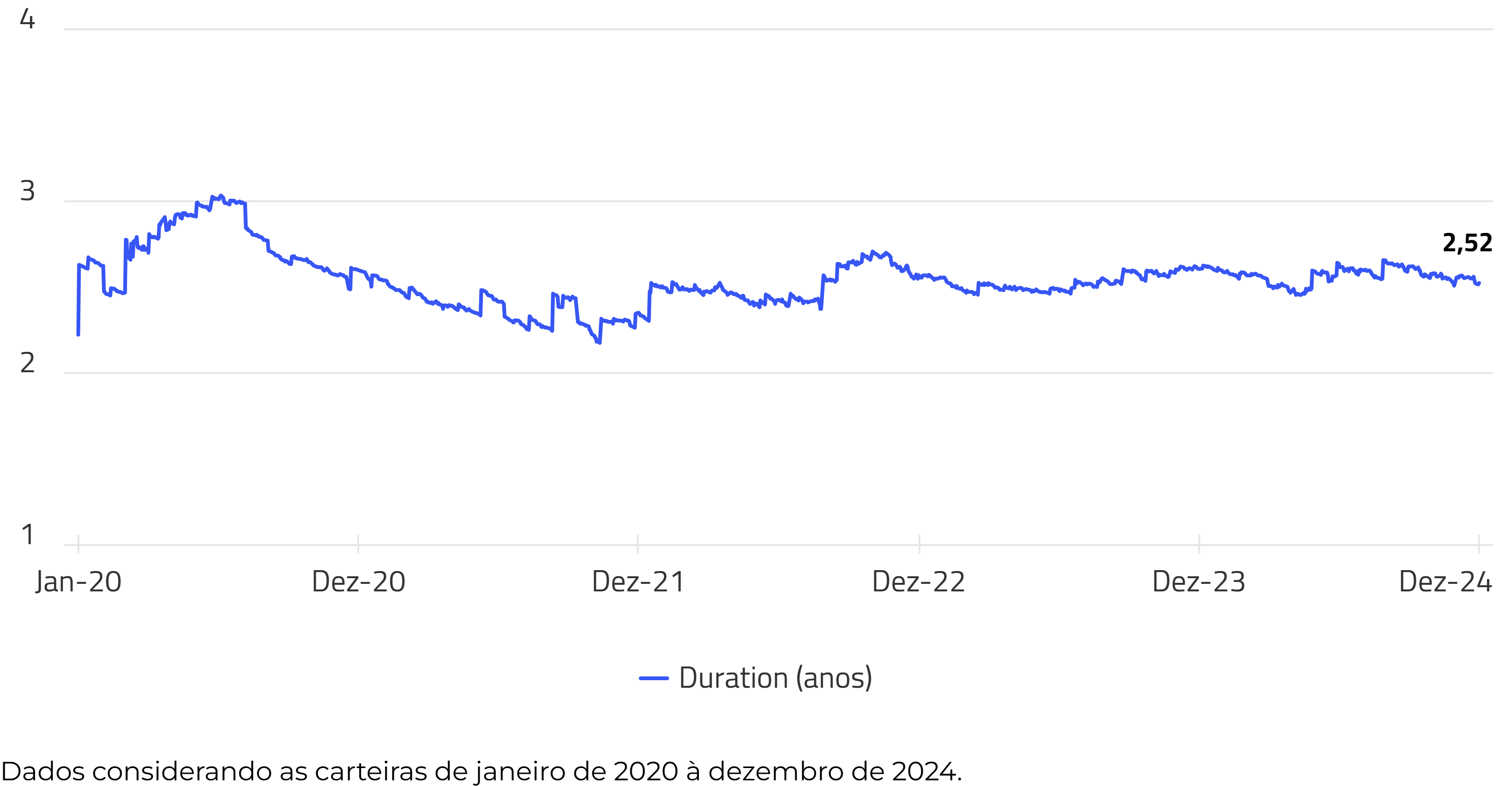 Duration média da carteira continua estável, com perfil de duration bem distribuído entre os papéis.