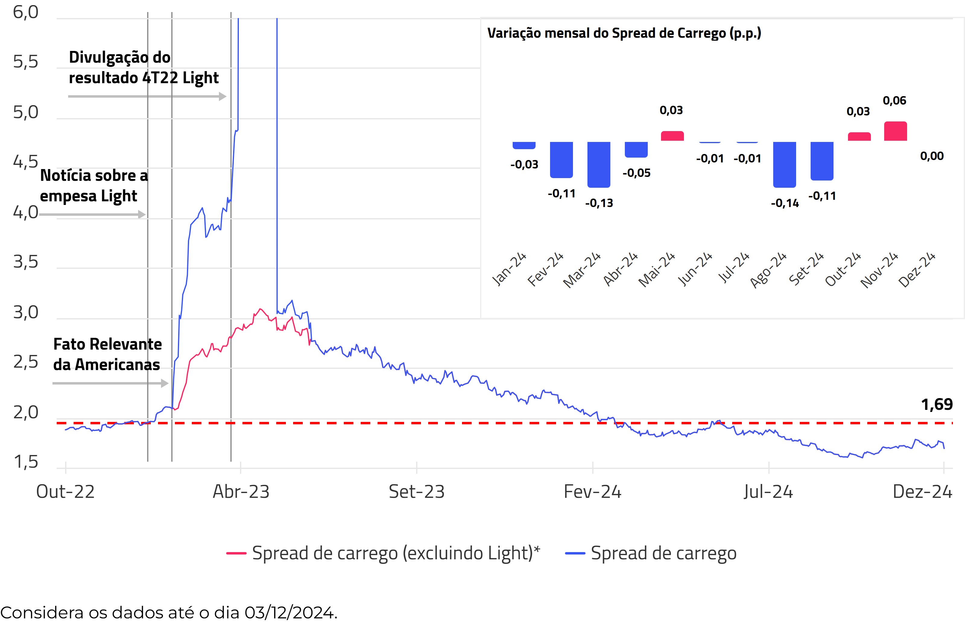 No rebalanceamento de dezembro, o spread de carrego foi registrado em DI + 1,69%, mesmo valor do rebalanceamento de novembro. Desde o início de 2024 até o rebalanceamento de dezembro, o spread decresceu 0,45 p.p. em valores absolutos. No mês de dezembro de 2024 o spread permaneceu abaixo do valor que antecedeu a divulgação de fato relevante pela Americanas.