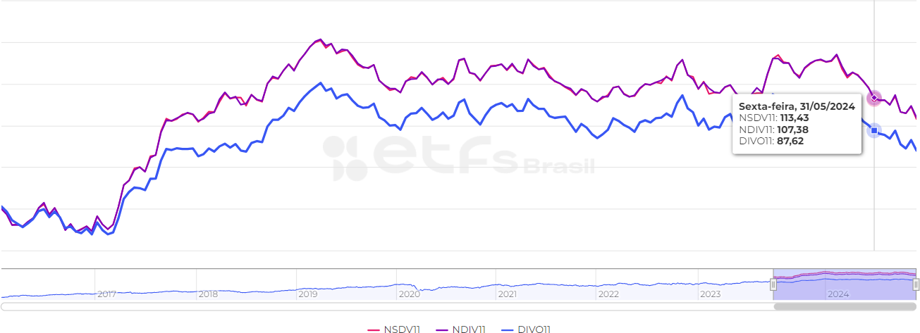 O NDIV11 é a versão pagadora de dividendos enquanto o NSDV11 reinveste todos seus proventos. Você pode conferir mais informações sobre esses ETFs nessa página do ETFs Brasil.