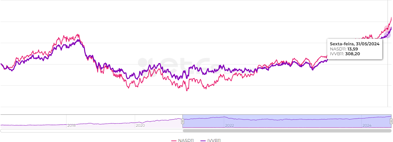 Uma comparação entre o NASD11 e o IVVB11 elaborada no ETFsBrasil traz informações sobre o comportamento entre os dois índices.
