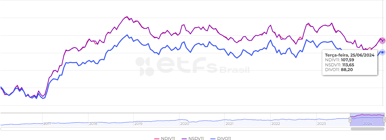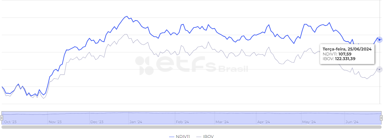 Essa comparação de NDIV11 em relação ao seu benchmark e outros índices similares pode ser visualizada no comparador do ETFs Brasil.